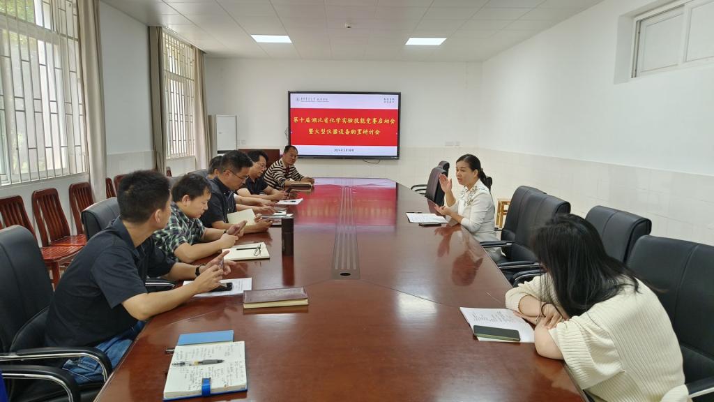 在化学楼A106召开第十届湖北省化学实验技能竞赛启动会暨大型仪器设备购置研讨会。副院长曹敏惠,化学系主任梁建功,系副主任项勇刚、刘永红,化学实验教学中心副主任王嘉讯、石炜等参加座谈交流,会议由副院长曹敏惠主持。